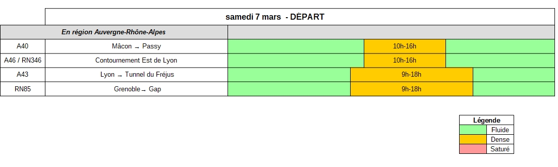 Samedi 7 mars, dans le sens des départs, les axes desservant la région Auvergne-Rhône-Alpes seront très fréquentés, à l’instar des autoroutes A40, A46, A43 et la RN85. Les encombrements devraient s’étendre du milieu de la matinée jusqu’en début de soirée.