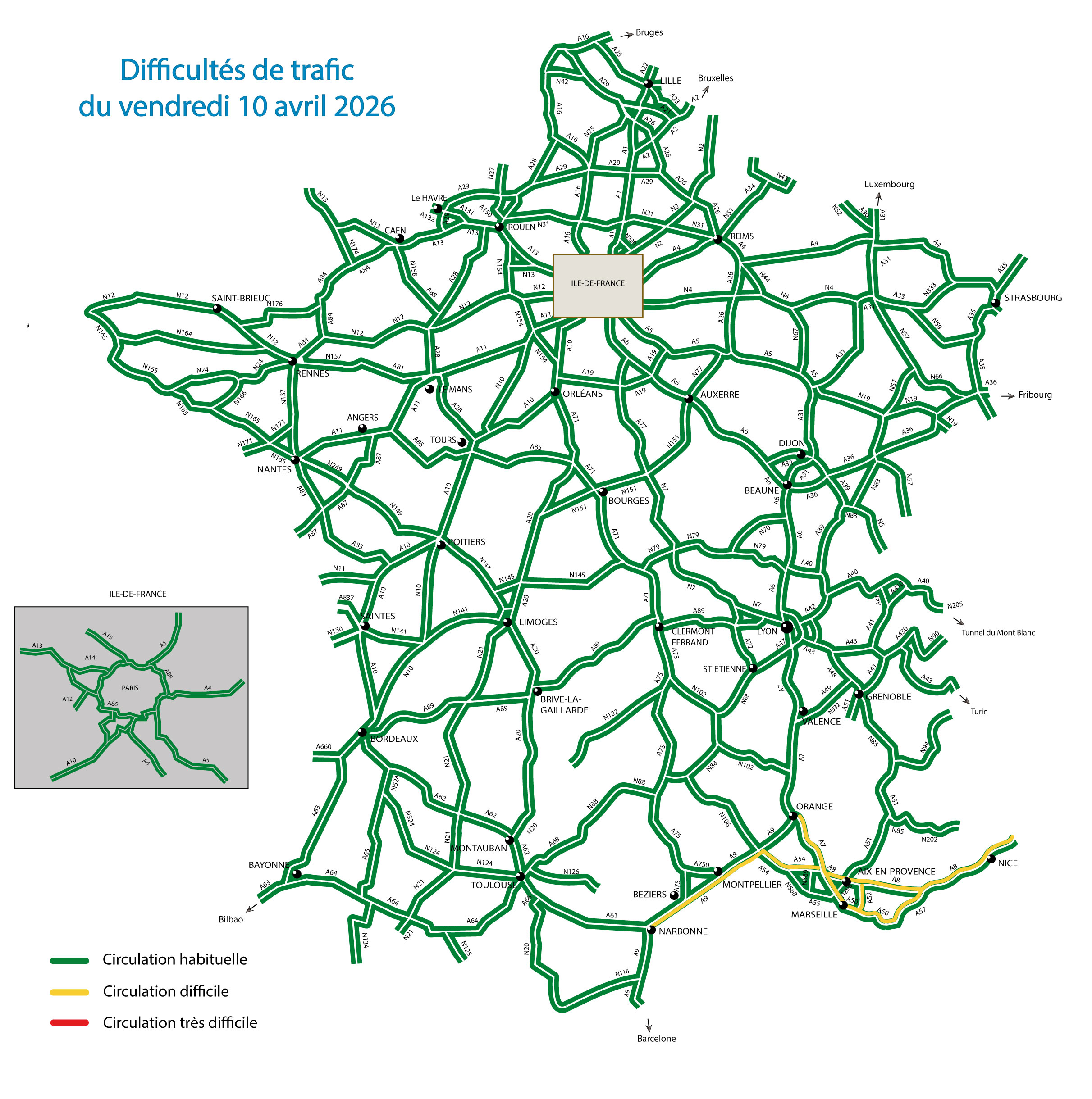 Vendredi 10 avril, dans le sens des retours, les principales congestions de la journée devraient se concentrer sur les axes desservant la façade méditerranéenne. Les autoroutes A7, A8, A9, A50, A52, A54 et A57 devraient être très sollicitées entre le milieu et la fin de l’après-midi.