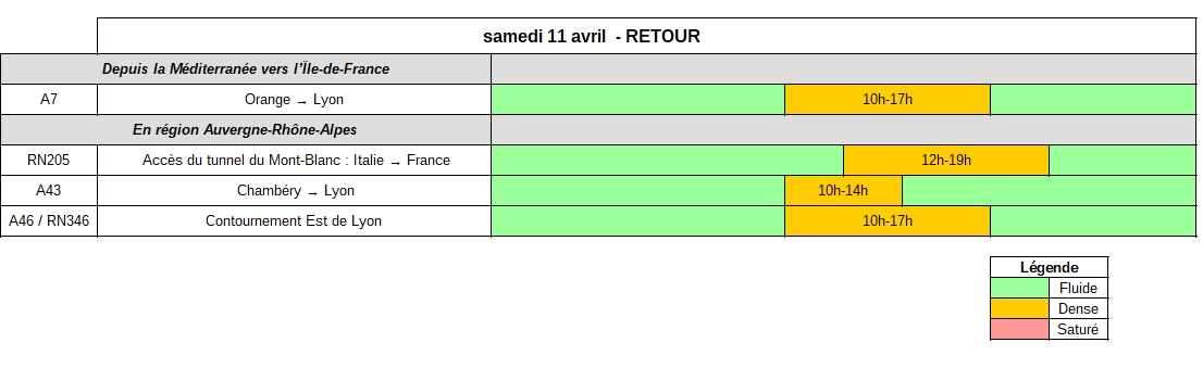 Samedi 11 avril, dans le sens des retours, les mouvements sur les routes d’Auvergne-Rhône-Alpes devraient être importants en particulier sur les autoroutes A7 et A43, sur le contournement est de Lyon et pour l’accès au tunnel du Mont-Blanc. Ils devraient durer du milieu de la matinée jusqu’en fin d’après-midi.