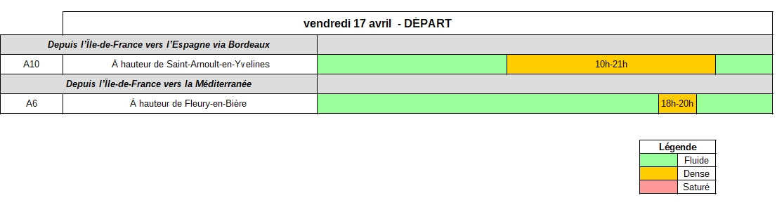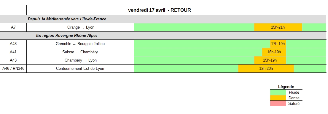 Vendredi 17 avril, dans le sens des départs, en Île-de-France, dès le milieu de la matinée, on observera une circulation plus dense qu’à l’accoutumée sur l’autoroute A10 et dans une moindre mesure sur l’autoroute A6. Elle devrait s’intensifier à partir du début de l’après-midi par la conjugaison des trajets pendulaires et des départs en congés. Dans le sens des retours, la circulation devrait être dense sur les axes de la région Auvergne-Rhône-Alpes à l’instar des autoroutes A7, A41, A43, A46 et A48. Les difficultés devraient s’étendre du début de l’après-midi jusqu’en début de soirée.