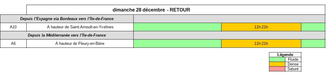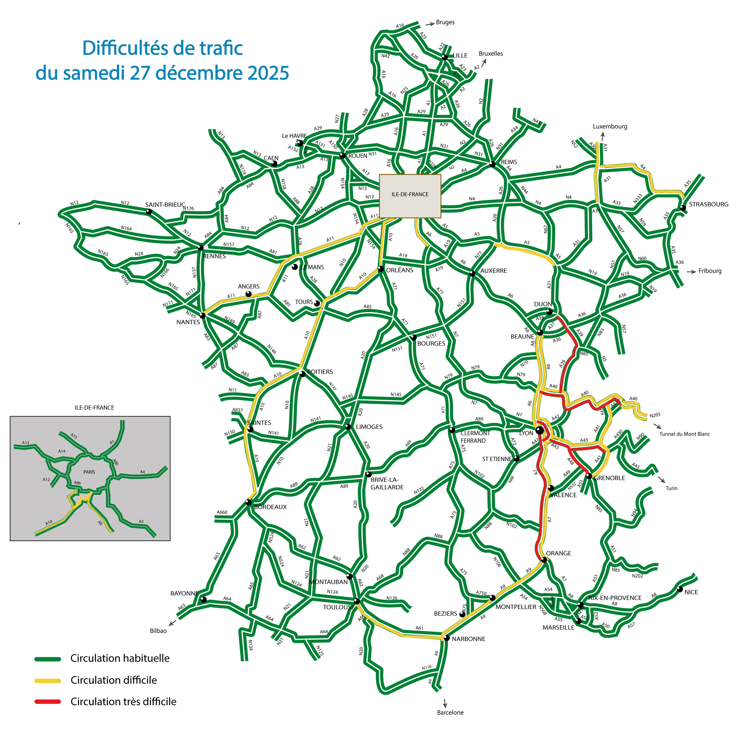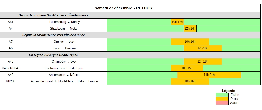 Samedi 27 décembre, dans le sens des départs, Les niveaux de trafic seront élevés dès le la début de la matinée jusque tard dans la soirée, en particulier en région Auvergne-Rhône-Alpes. Les axes desservant la côte atlantique devraient connaître des niveaux de trafic importants (A10, A11), tout comme ceux de la région Auvergne-Rhône-Alpes où une circulation très dense est attendue sur les autoroutes A7, A39, A40, A43 et A48, ainsi que sur le contournement Est de Lyon (A46/N346) et l’accès au tunnel du Mont-Blanc (N205). La circulation devrait être également très importante en direction de la côte méditerranéenne (A8, A9 et A61). En Île-de-France, les usagers devraient être nombreux dès le début de la matinée et devraient rendre la circulation difficile jusqu’en fin d’après-midi.