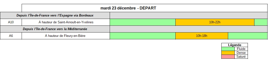 Mardi 23 décembre, en Île-de-France, dans le sens des départs, des niveaux de trafic élevés sont attendus dès la fin de matinée. La combinaison des départs et des trajets pendulaires risque de rendre la circulation intense sur l’ensemble de l’Île-de-France jusqu’en début de soirée.