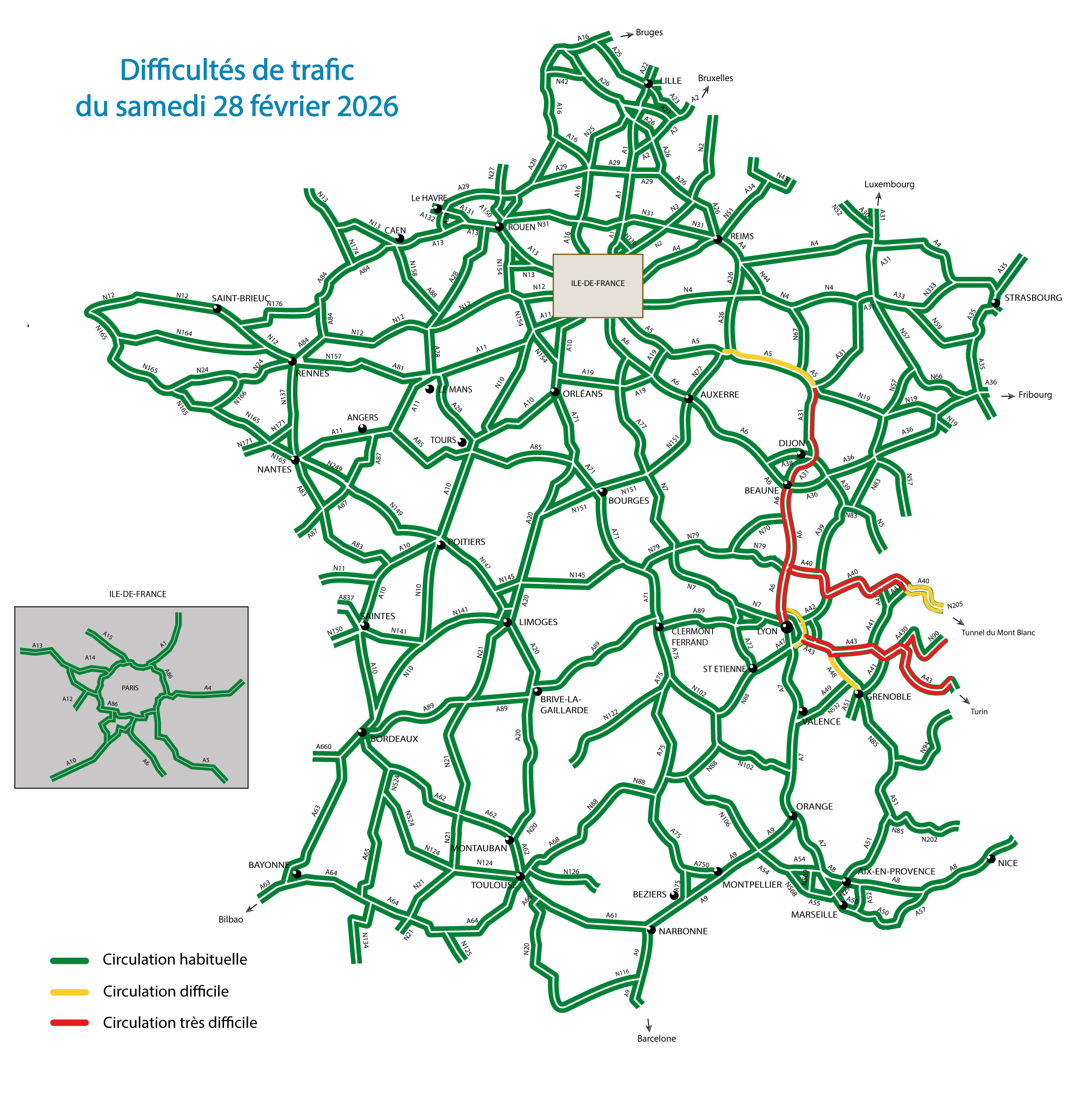 Samedi 28 février, dans le sens des départs, la journée devrait être particulièrement difficile en direction de la région Auvergne-Rhône-Alpes. La circulation devrait être très dense sur les autoroutes A6, A40, A43 et la RN90, depuis le début de la matinée et jusqu’en début de soirée. Dans le sens des retours, des encombrements très importants sont attendus en région Auvergne-Rhône-Alpes (A40, A43, A46) en Bourgogne et dans l’Est (A5, A31, A6), du début de la matinée, jusqu’en début de soirée.