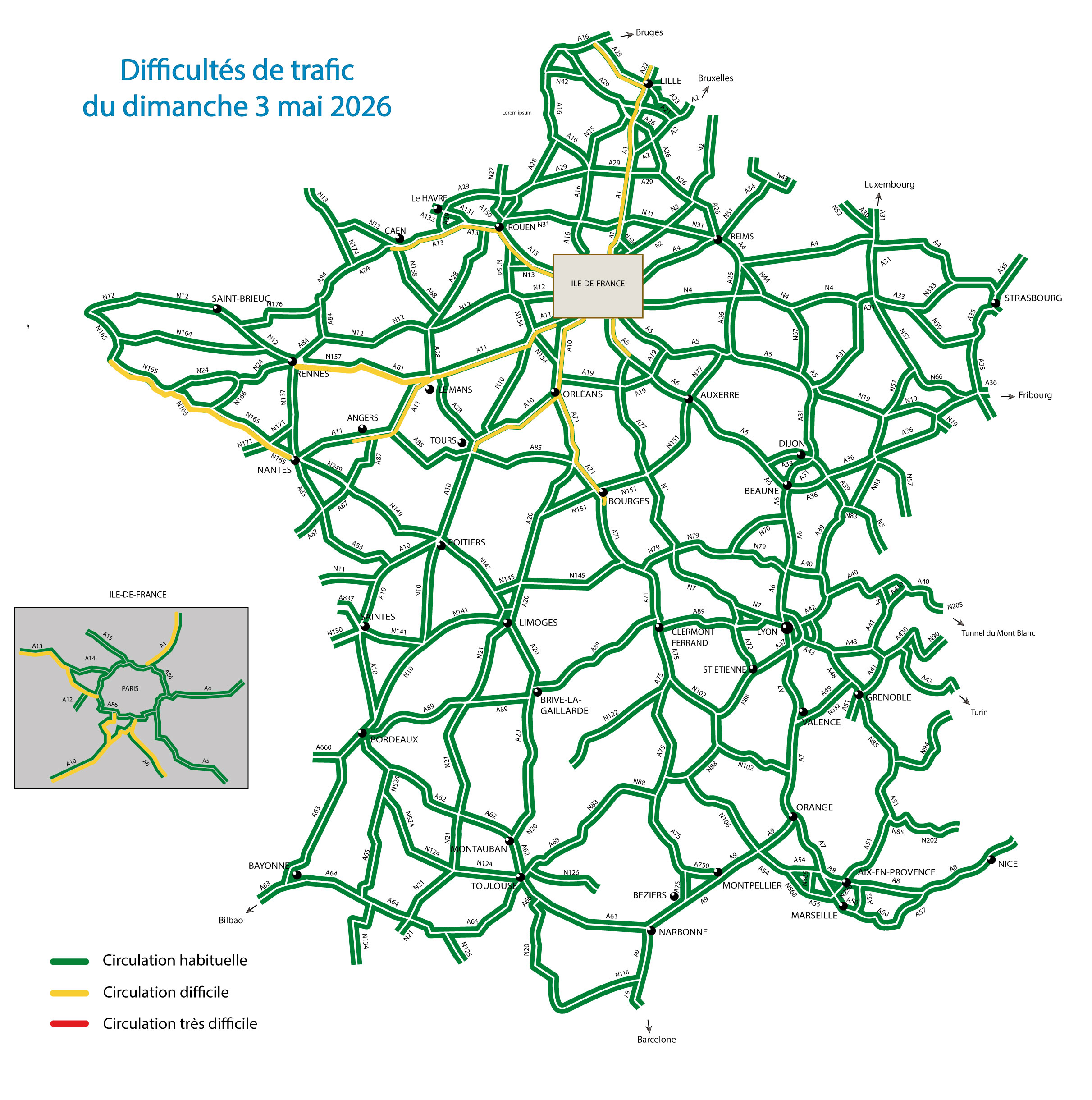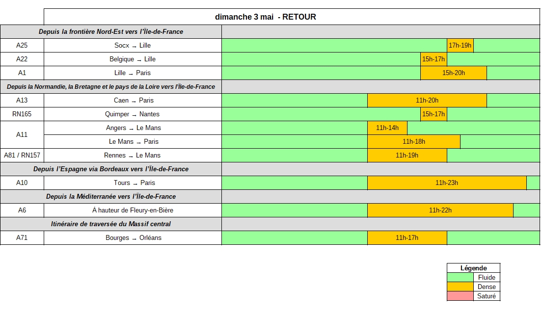 Dimanche 3 mai, dans le sens des retours, les axes de la moitié Nord-Ouest devraient être très sollicités, généralement dès la fin de la matinée. En effet, une circulation dense pourrait être observée au départ du Nord du pays, de la côte normande, sur les axes desservant la côte atlantique.
