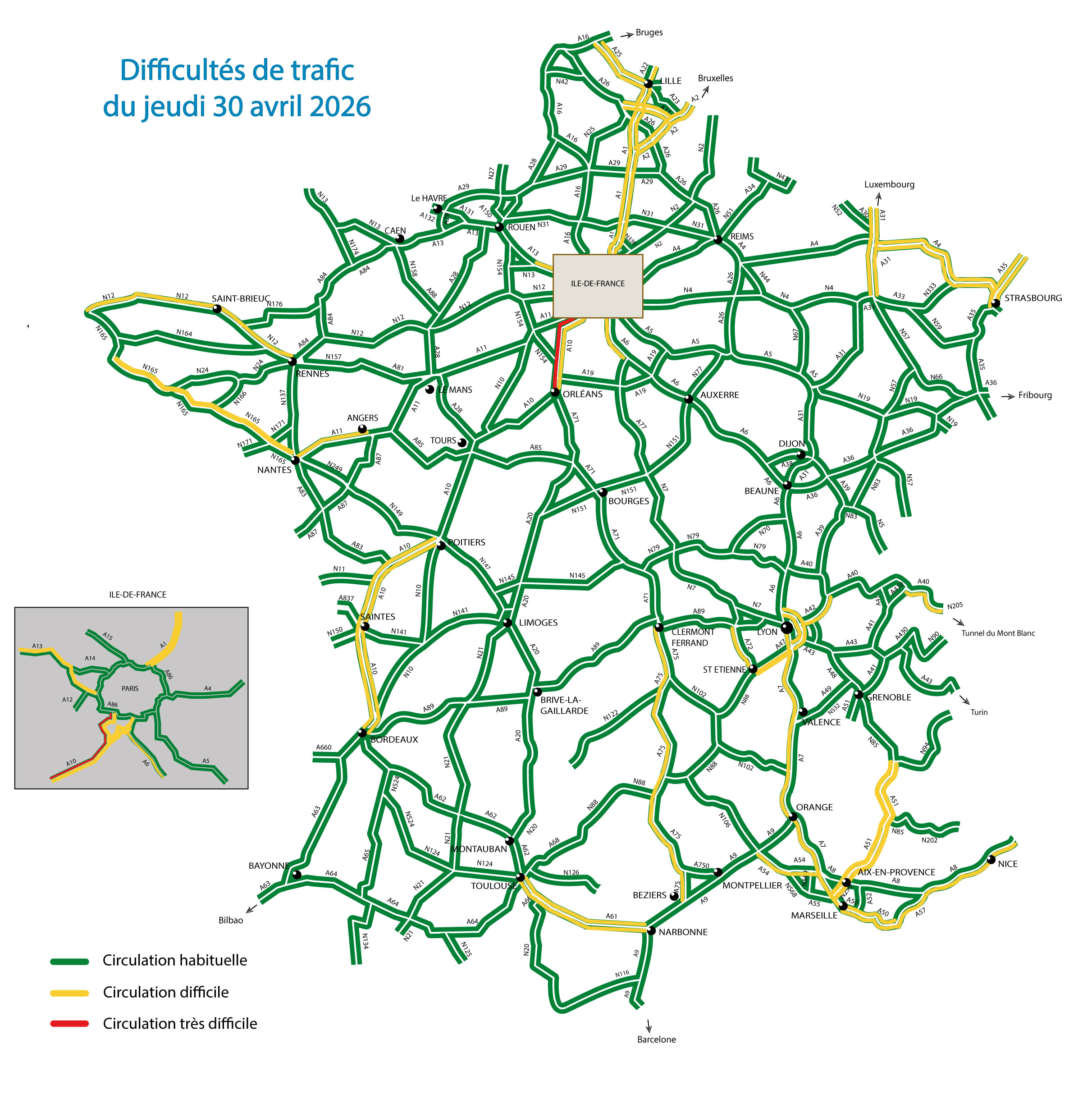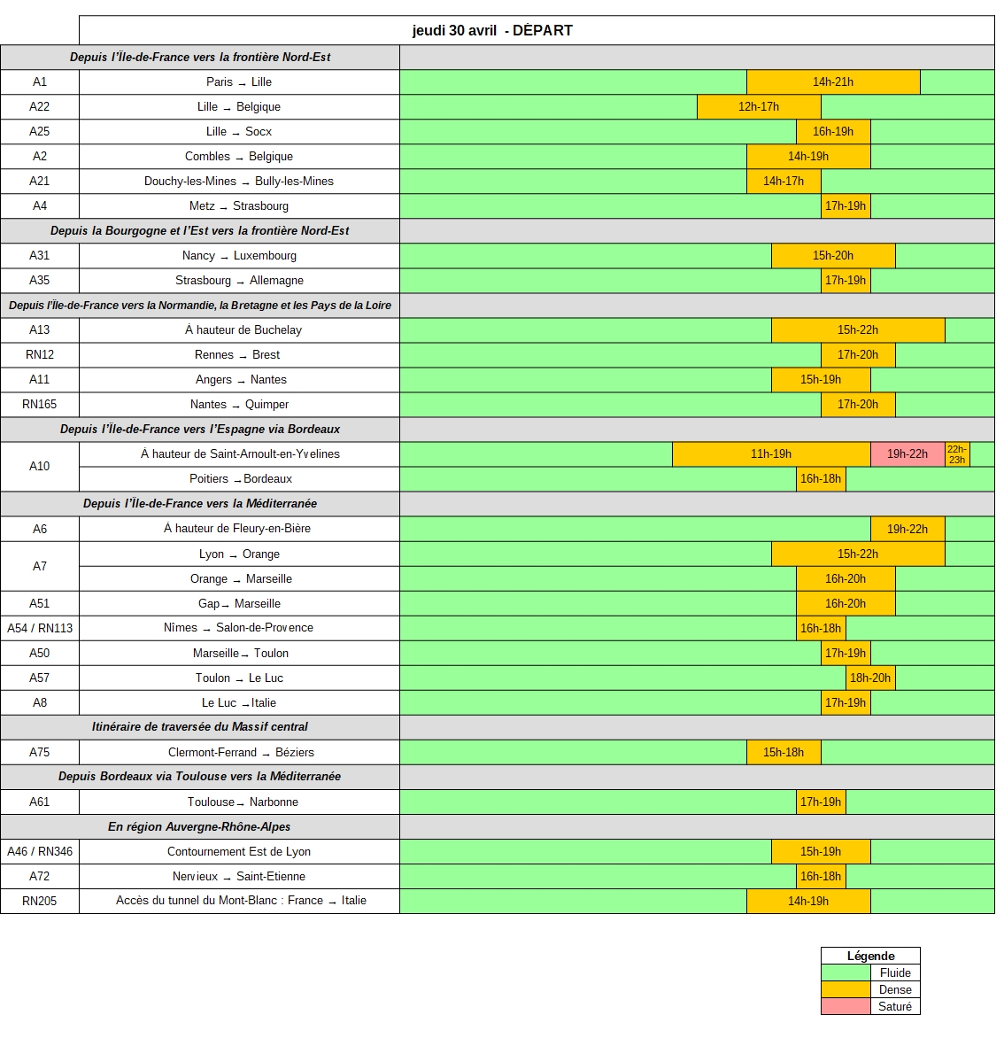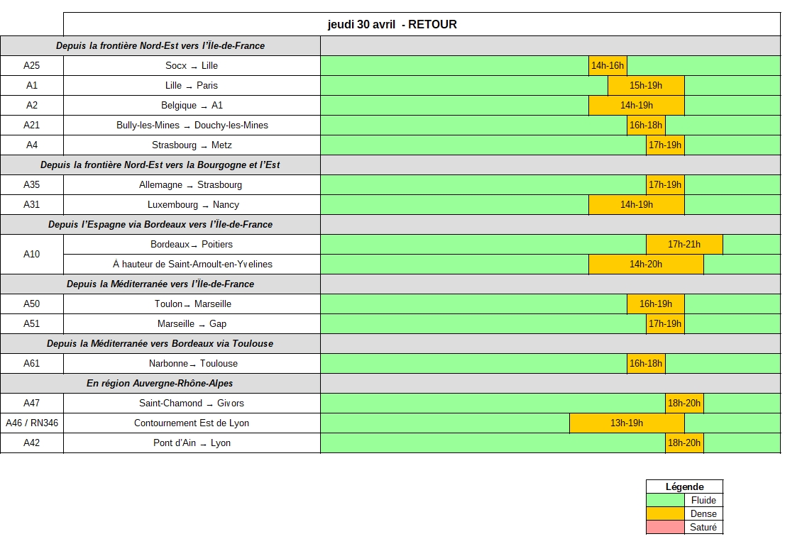 Jeudi 30 avril, dans le sens des départs, des difficultés sont à prévoir sur l’ensemble des grands axes, globalement du milieu de l’après-midi jusqu’en début de soirée. La circulation devrait être particulièrement dense sur les routes desservant le quart Nord-Est. Les mouvements devraient également être importants en direction de la côte atlantique, du pourtour méditerranéen et en région Auvergne-Rhône-Alpes.