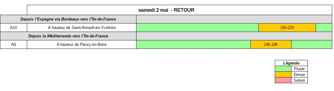 Samedi 2 mai, dans le sens des retours, en Île-de-France, une circulation plus dense qu’à l’accoutumée pourrait être observée sur les autoroutes A10 et A6 entre le milieu d’après-midi et le début de soirée.