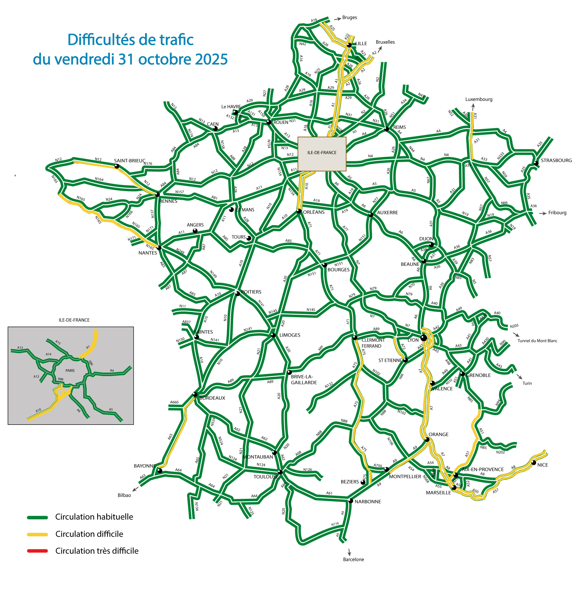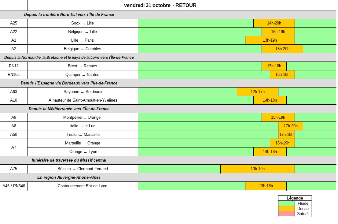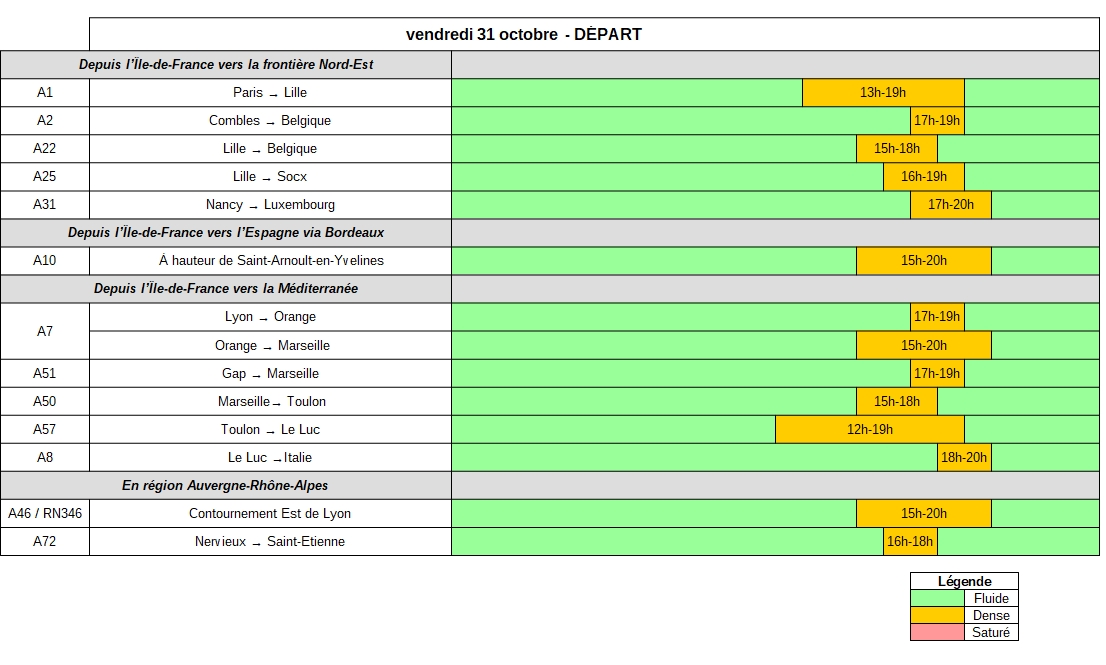 Vendredi 31 octobre, dans le sens des départs, les principales congestions sont attendues en direction des frontières du Nord Est (A1, A2, A31) et de la côte méditerranéenne (A7, A8, A50, A51). Elles devraient débuter en début d’après-midi et se poursuivre jusqu’en début de soirée.