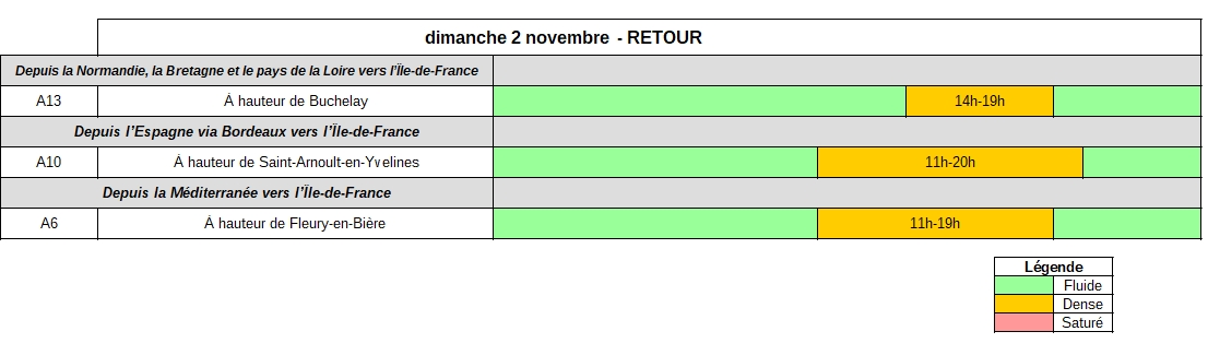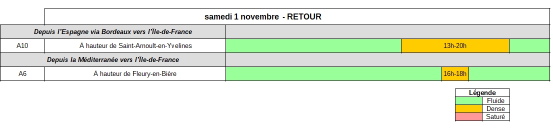 Samedi 1er novembre, dans le sens des retours, en Île-de-France, on pourra observer une circulation plus dense qu’à l’accoutumée à partir du milieu de l’après-midi, notamment sur l’autoroute A10. Elle sera renforcée par les nombreux déplacements engendrés par la Toussaint et ainsi prolonger les difficultés jusqu’en en début de soirée.