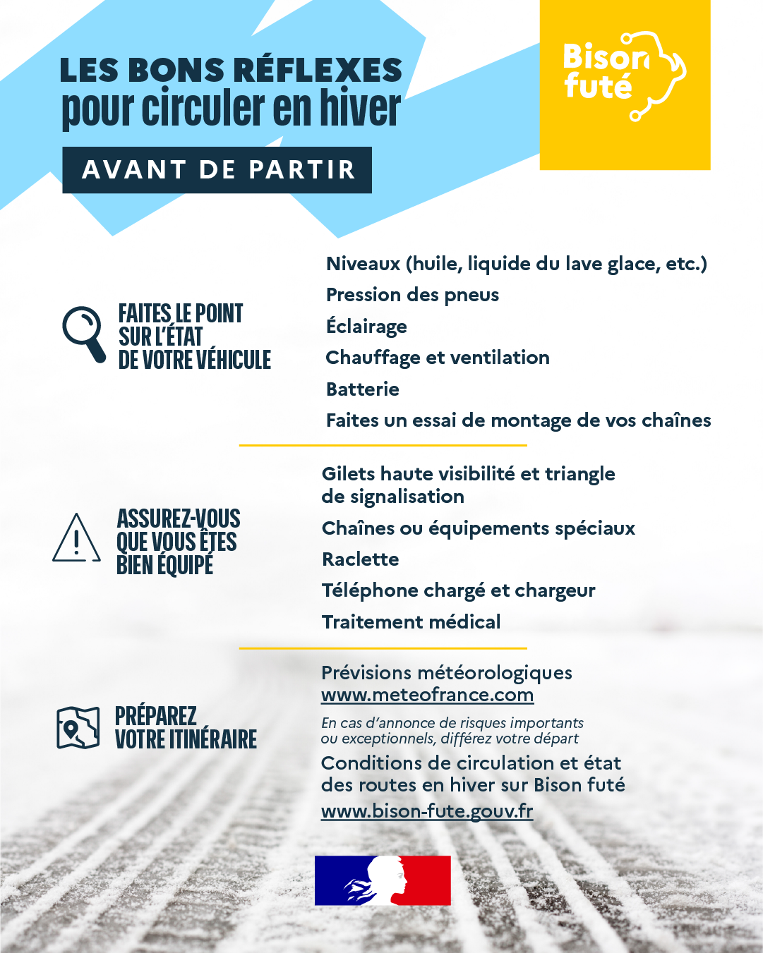 Les conditions climatiques hivernales peuvent rendre les routes difficilement praticables et particulièrement dangereuses. Pour rouler en toute sécurité, il est nécessaire d’adapter sa conduite et prendre un certain nombre de précautions telles que :