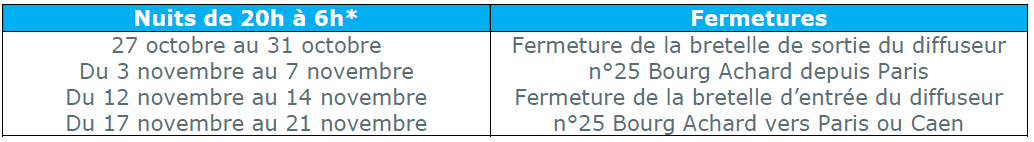 -  L’autoroute A154, sens Évreux -> Rouen, de 20h à 6h* :- 2 nuits du 5 au 7 novembre*