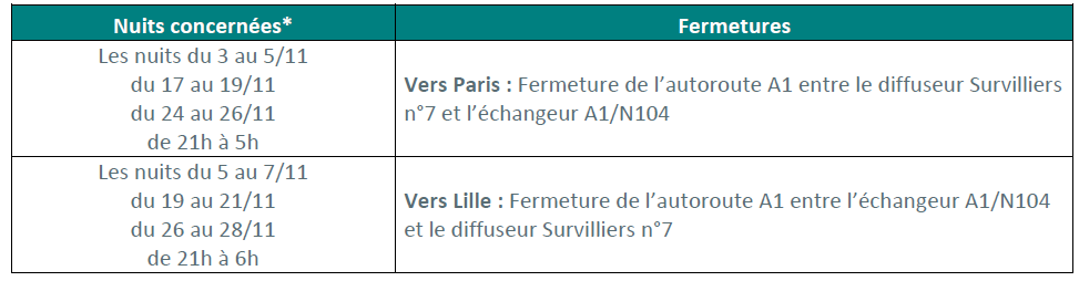 - Durant plusieurs nuits en novembre, l’A1 sera fermée entre le diffuseur de Survilliers n°7 et l’échangeur A1/N104.
