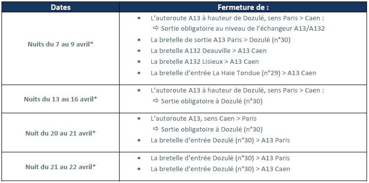A la suite du passage de l’A13/A14 en péage en flux libre il y a un an, SANEF continue les travaux sur l’ancienne barrière de péage de Dozulé. Pour permettre l’avancée du chantier et garantir la sécurité de tous, des fermetures de l’autoroute A13 et de certaines bretelles du diffuseur de Dozulé (n°30) et de l’échangeur A13/A132 sont nécessaires, de nuit, de 20h à 6h*, entre le 7 et le 22 avril 2026* selon le calendrier suivant :